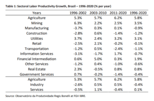 Conforme o estudo da Fundação Getúlio Vargas a seguir, o crescimento de produtividade médio de 1996 à 2020 anualizado por cada trabalhador dos três diferentes setores da economia foi: